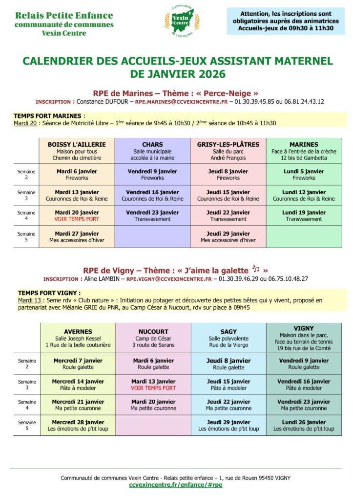 Les inscriptions sont obligatoires auprès des RPE de Marines (01.30.39.45.85 ou 06.81.24.43.12) ou de Vigny (01.30.39.46.29 ou 06.75.10.48.27)