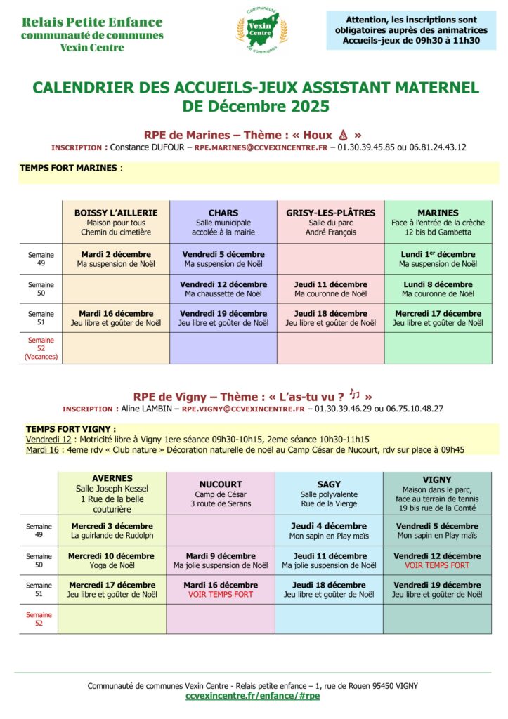 Le pôle parentalité de la communauté de communes Vexin Centre propose en décembre : Atelier motricité libre à Grisy-les-Plâtres le 9 décembre Spectacle de Noël Tèmpi Tèmtoa à Marines le 10 décembre et les habituels rendez-vous des lieux parents/enfants (LAEP) dans...