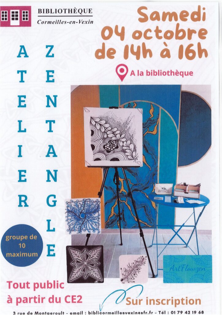 La bibliothèque et Art Flowzen vous proposent de participer, le Samedi 4 Octobre 2025 de 14H à 16H, à un atelier ZENTANGLE, un atelier doux et guidé, pour dessiner sans pression, retrouver le calme intérieur et libérer votre expression.