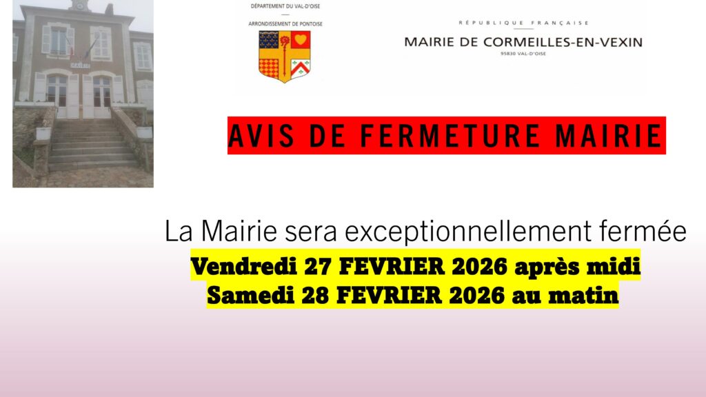 La Mairie sera exceptionnellement fermée le Vendredi 27 FEVRIER 2026 après midi et Samedi 28 FEVRIER 2026 au matin.