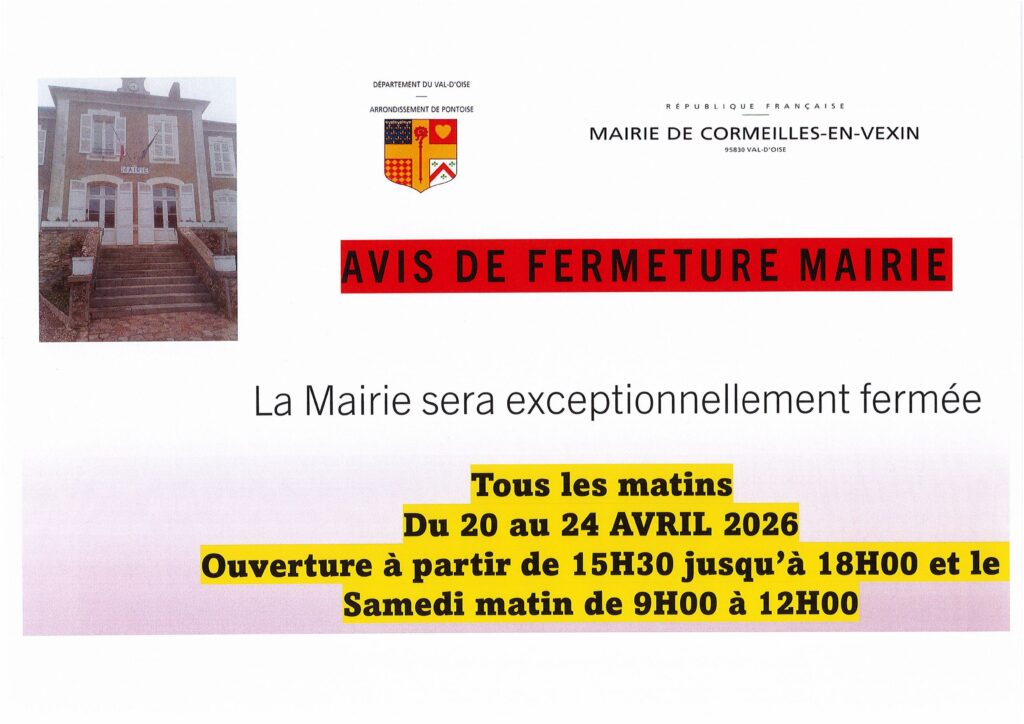 La Mairie sera exceptionnellement fermée le Samedi 18 Avril 2026 au matin Veuillez nous excuser pour la gêne occasionnelle
