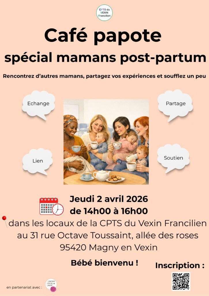 Dans le cadre de l’action « La bonne utilisation du système de santé – Parentalité », les professionnels de santé de la CPTS du Vexin Francilien, en partenariat avec le CLS, mettent en place un Café Papote à destination des mamans en post-partum.