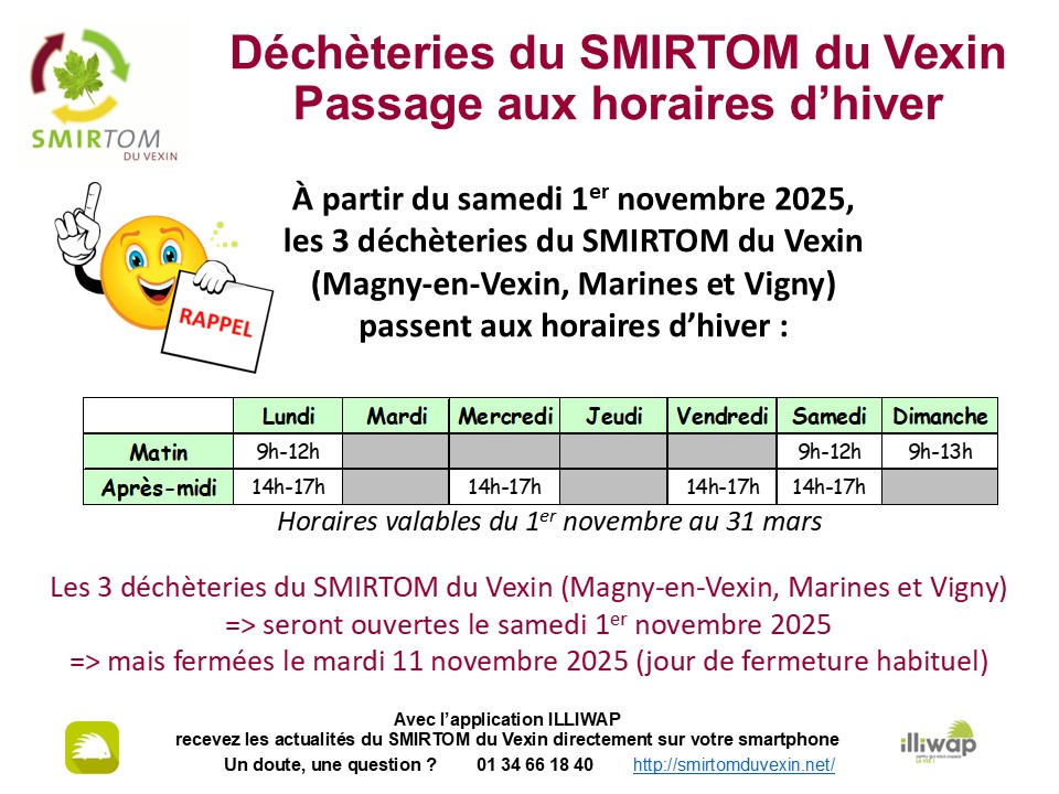 Les 3 déchèteries du SMIRTOM passent aux horaires d’hiver.