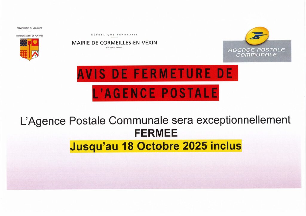 L’Agence Postale Communale sera exceptionnellement fermée jusqu’au 18 Octobre inclus