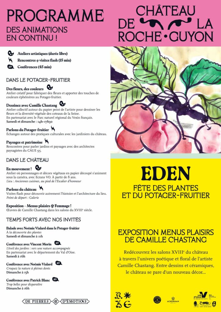 Au programme de cette édition : exposition de l’artiste Camille Chastang, ateliers artistiques, vente de plantes, rencontres avec les jardiniers du Château et les pépiniéristes, visites flash, conférences sous les pommiers…