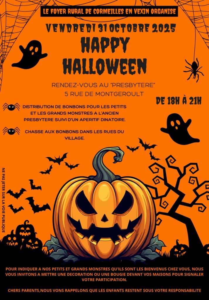 Le Foyer Rural de Cormeilles-en-Vexin vous donne rendez-vous le vendredi 31 octobre 2025 au Presbytère – 5 rue de Montgeroult, de 18h à 21h, pour une soirée monstrueusement festive ! ![]()