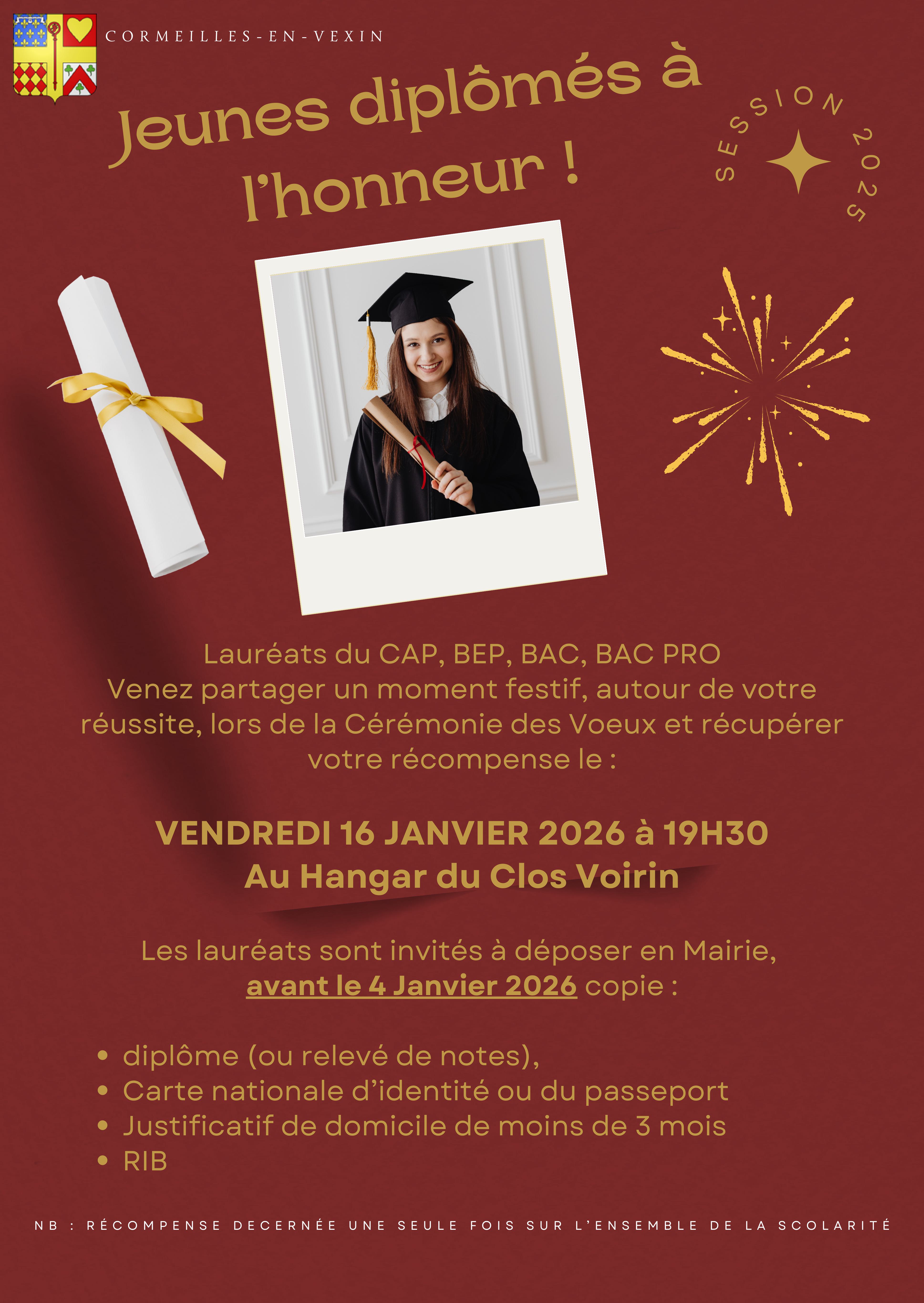 La commune récompense les jeunes Cormeillois, lauréats du CAP, BEP, BAC, BAC PRO en 2025.