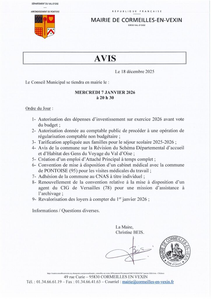 Le prochain Conseil Municipal se tiendra le Mercredi 7 Janvier 2026 à 20H30 en Mairie